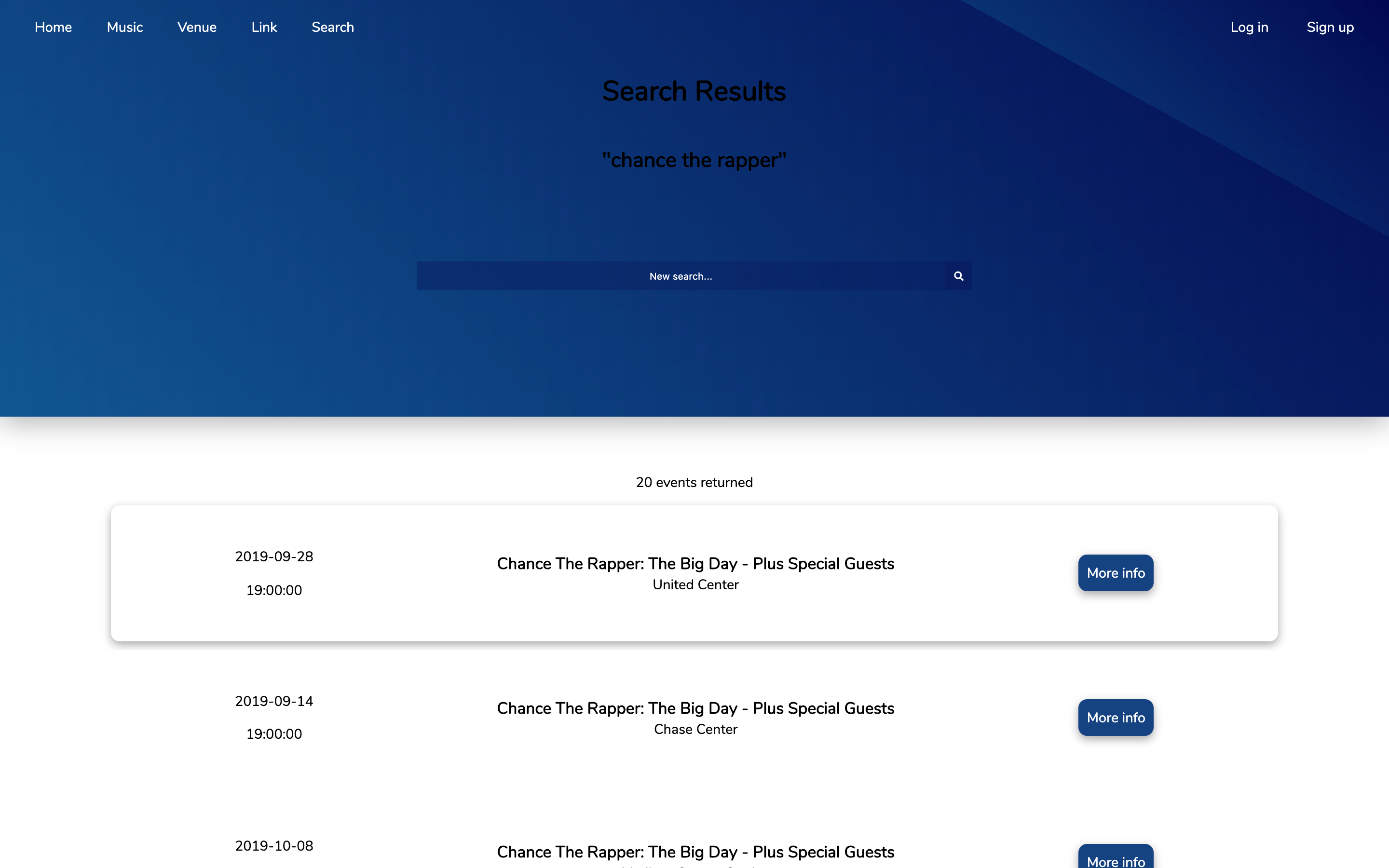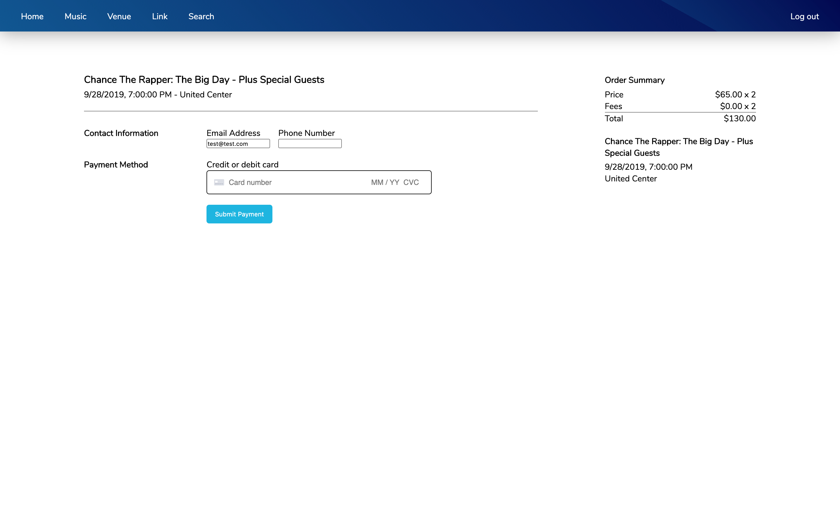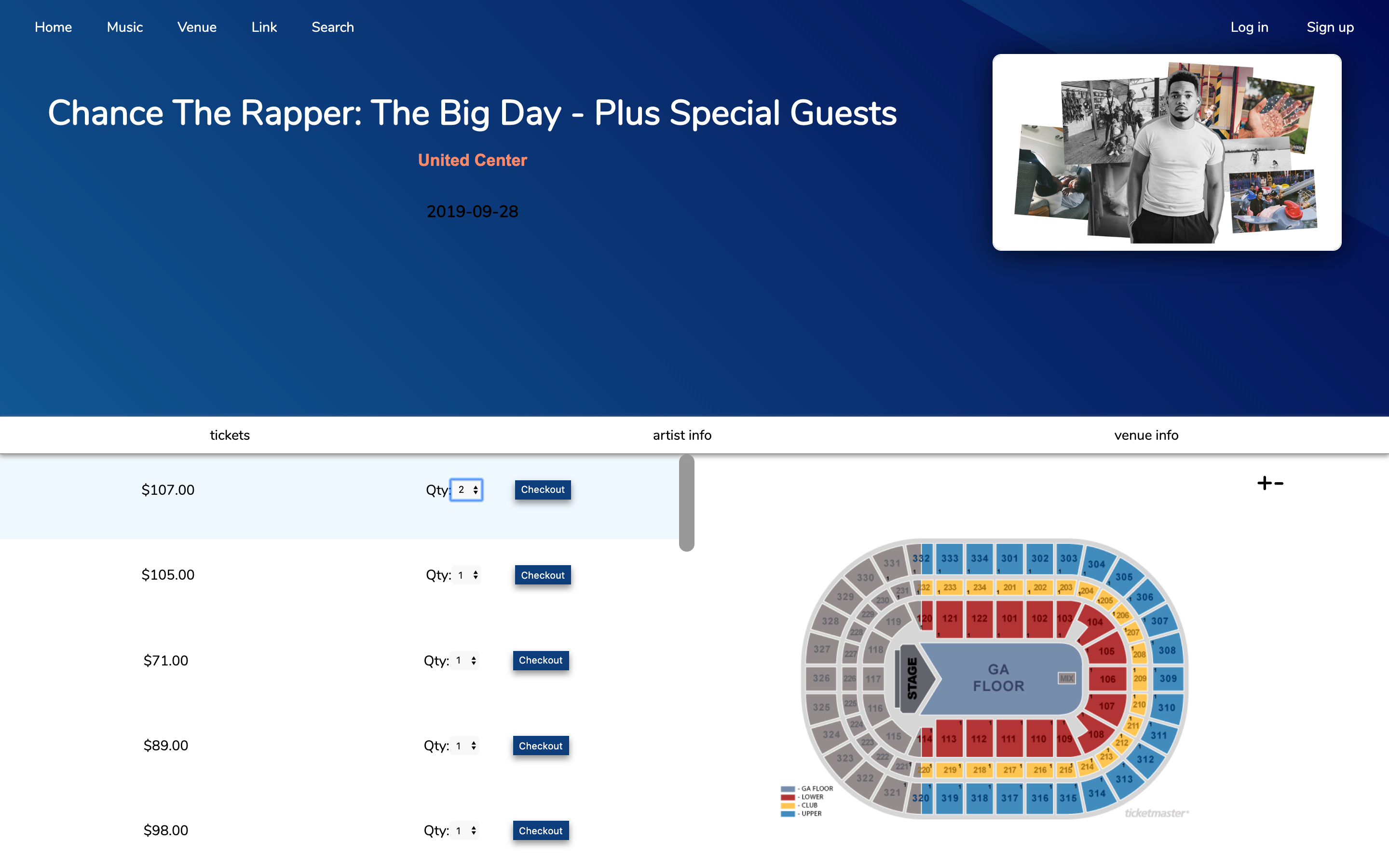 The aim of the project was to create a way to cut down on the amount of fees commonly associated with ticket purchases. By allowing the user to buy directly from the ticket stash allotted to venues, users can bypass some of the costlier ticket sellers. Users are able to search through the Ticketmaster API and explore events based on relevant search terms (including: artist, venue and location). Users are able to search without creating an account but if a user would like to favorite an event or make a purchase, an account will need to be created.